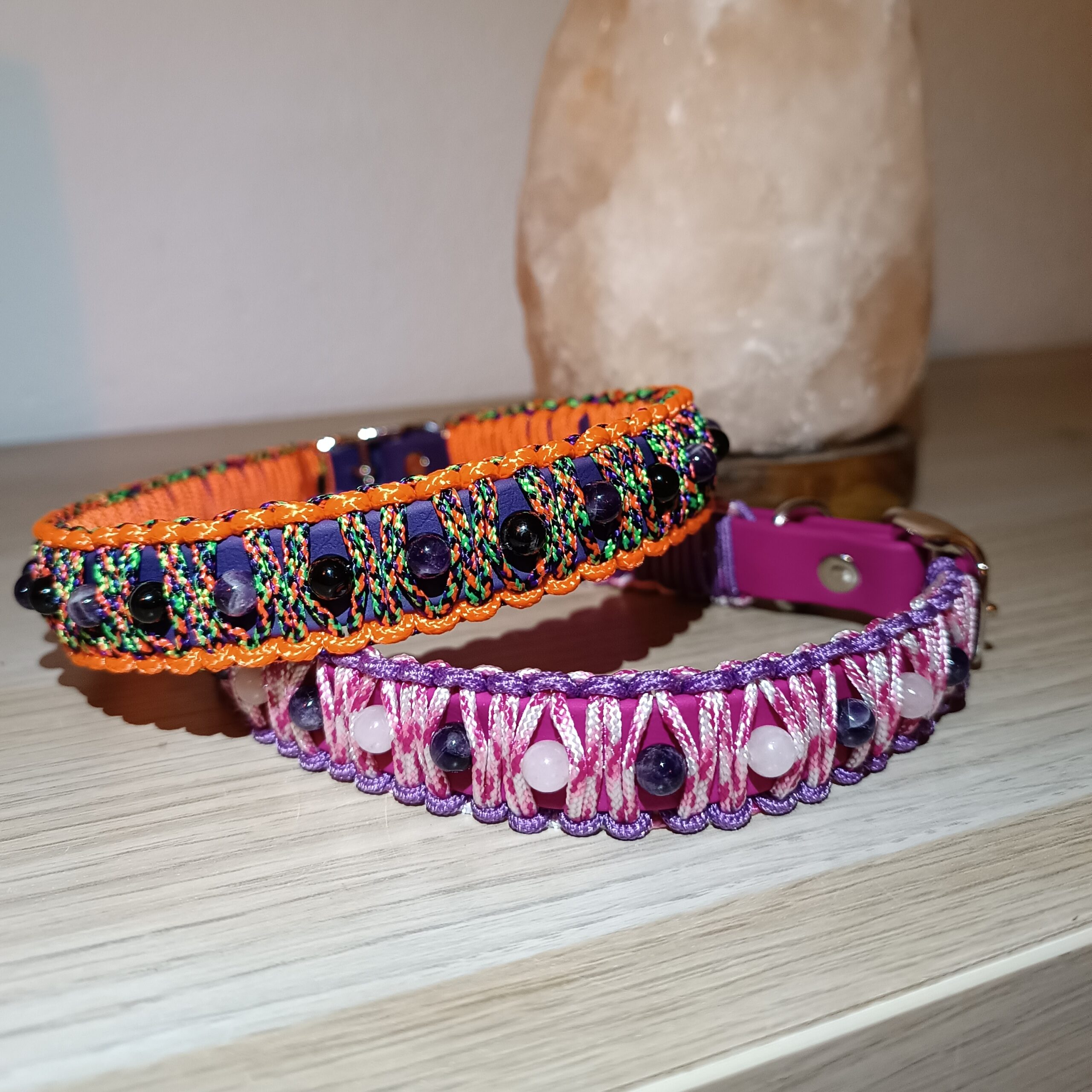 Une fois les pierres choisies, je passe à la sélection des matériaux qui composeront le collier ou bracelet. Je propose une variété de couleurs et de tressages pour garantir un bijou durable et esthétique. Chaque élément est minutieusement choisi dans le respect de l’humain et de l’animal.